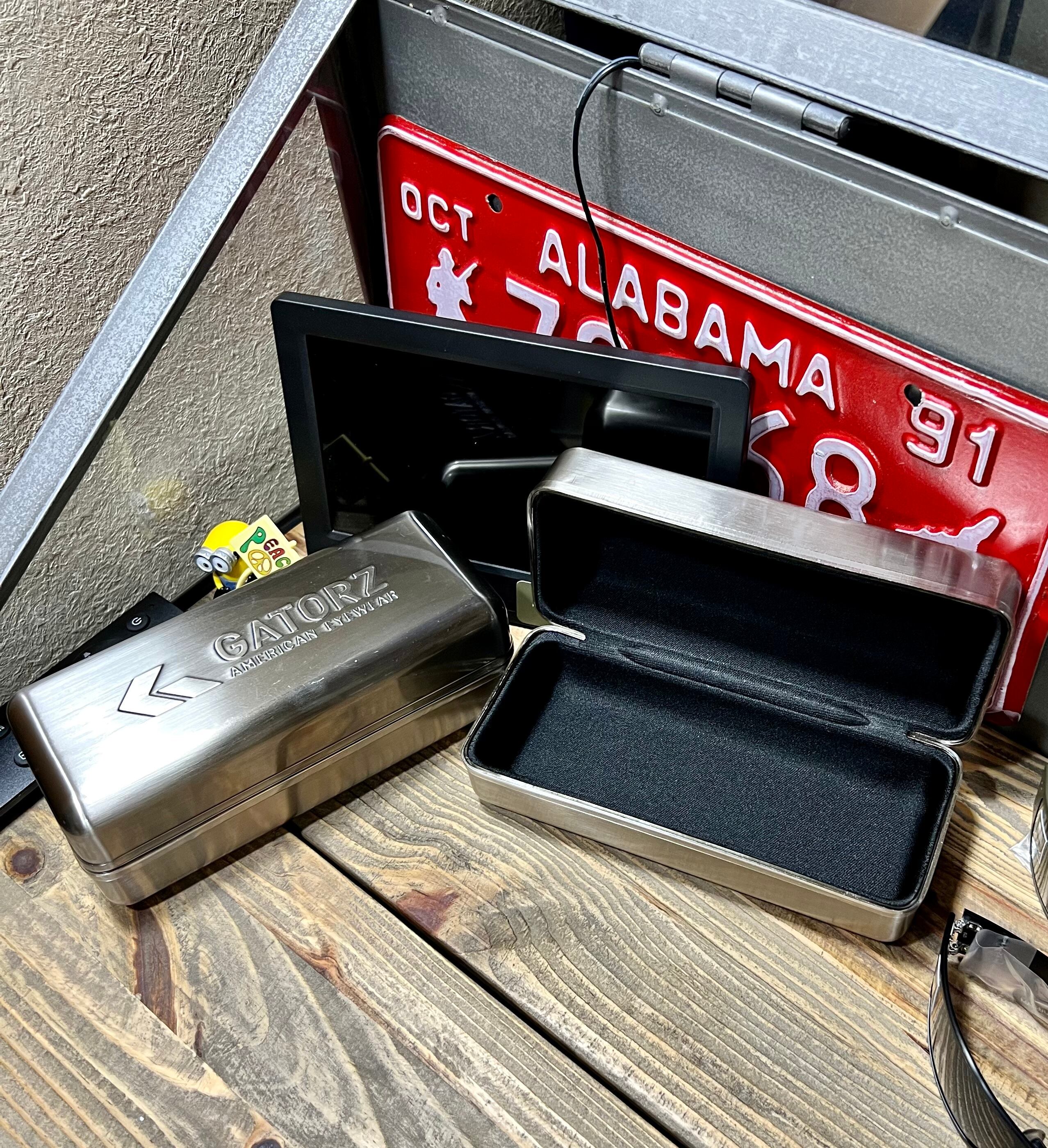 ヘアライン加工のシルバーで、無骨に魅せるGATORZロゴ入りメタルケース。